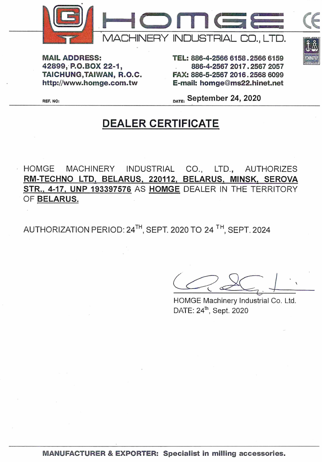 Настоящим сертификатом HOMGE MACHINERY INDUSTRIAL CO. подтверждает, что ООО "РМ-Техно" Беларусь, ул. Серова, 4-17*, УНП 193397576, является главным дилером на территории Беларуси.