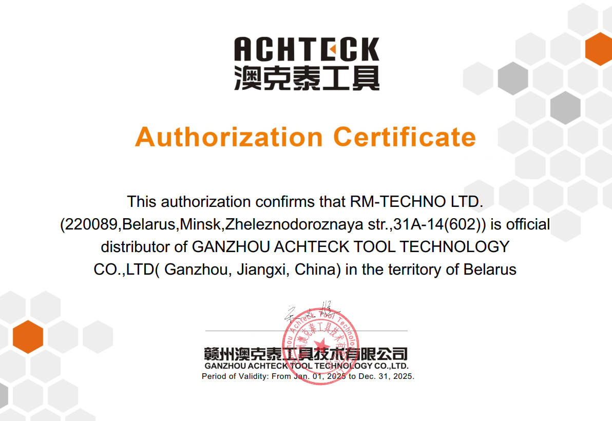 Данное разрешение подтверждает, что ООО "РМ-Техно" (220024, Беларусь, г. Минск, ул. Железнодорожная 33А, 6 этаж, офис 602.) является официальным представителем и поставщиком компании GANZHOU ACHTECK TOOL TECHNOLOGY CO., LTD. (Ганьчжоу, Цзянси, Китай) на территории Беларуси.