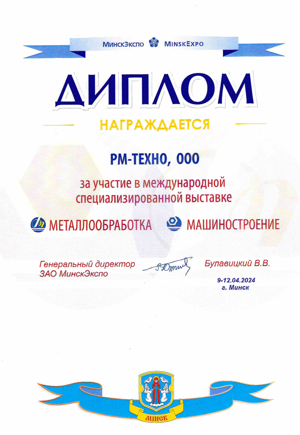 ООО "РМ-Техно" награждается за участие в международной специализированной выставке "Металлообработка. Машиностроение 2024"