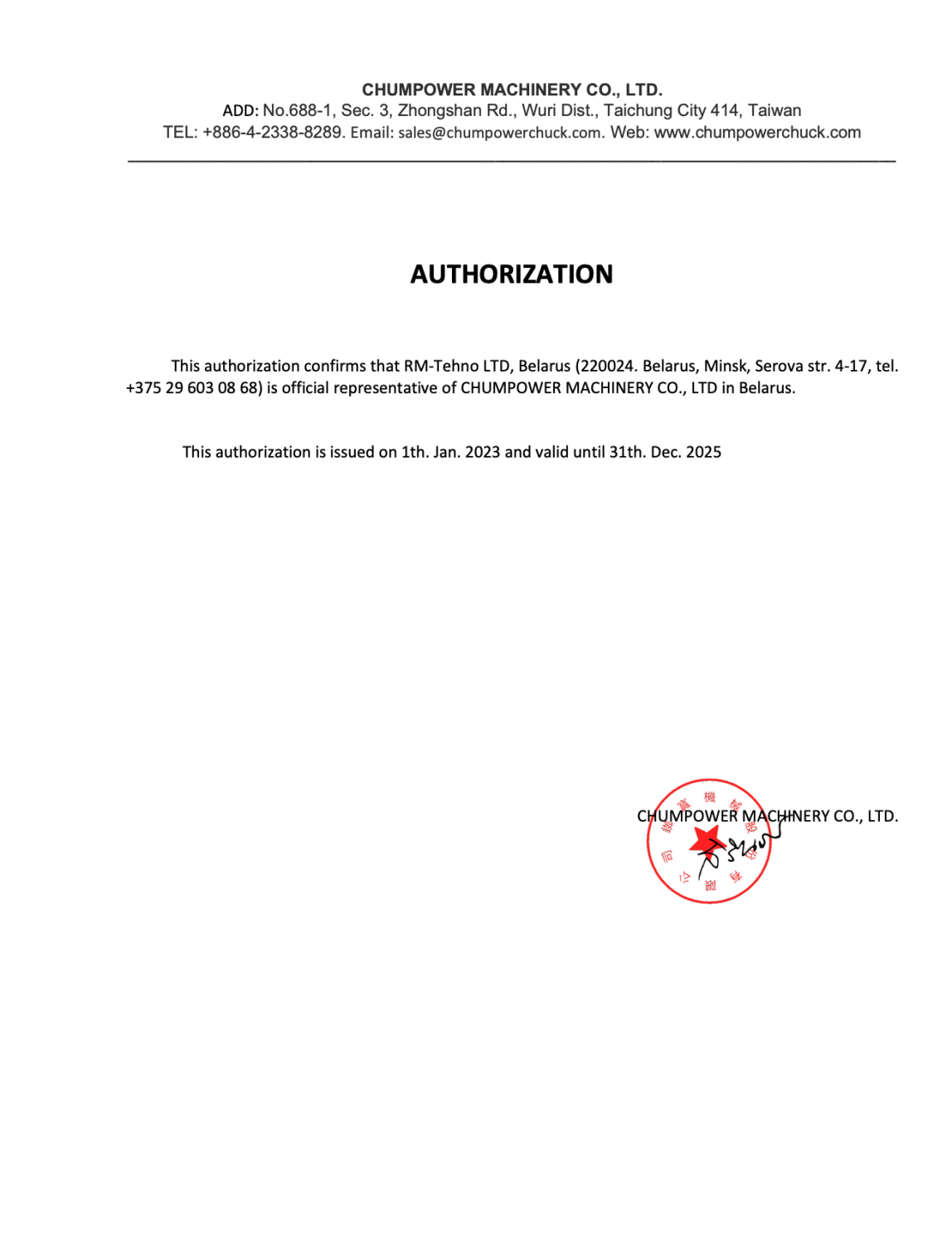 Данный сертификат подтверждает, что ООО "РМ-Техно" является официальным представителем "CHUMPOWER MACHINERY CO., LTD" на территории Республики Беларусь.