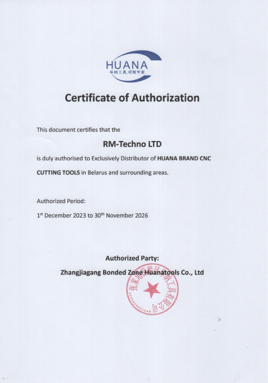 Данный документ подтверждает, что ООО "РМ-Техно" является эксклюзивным дистрибьютором "HUANA BRAND CNC CUTTING TOOLS" в Беларуси.