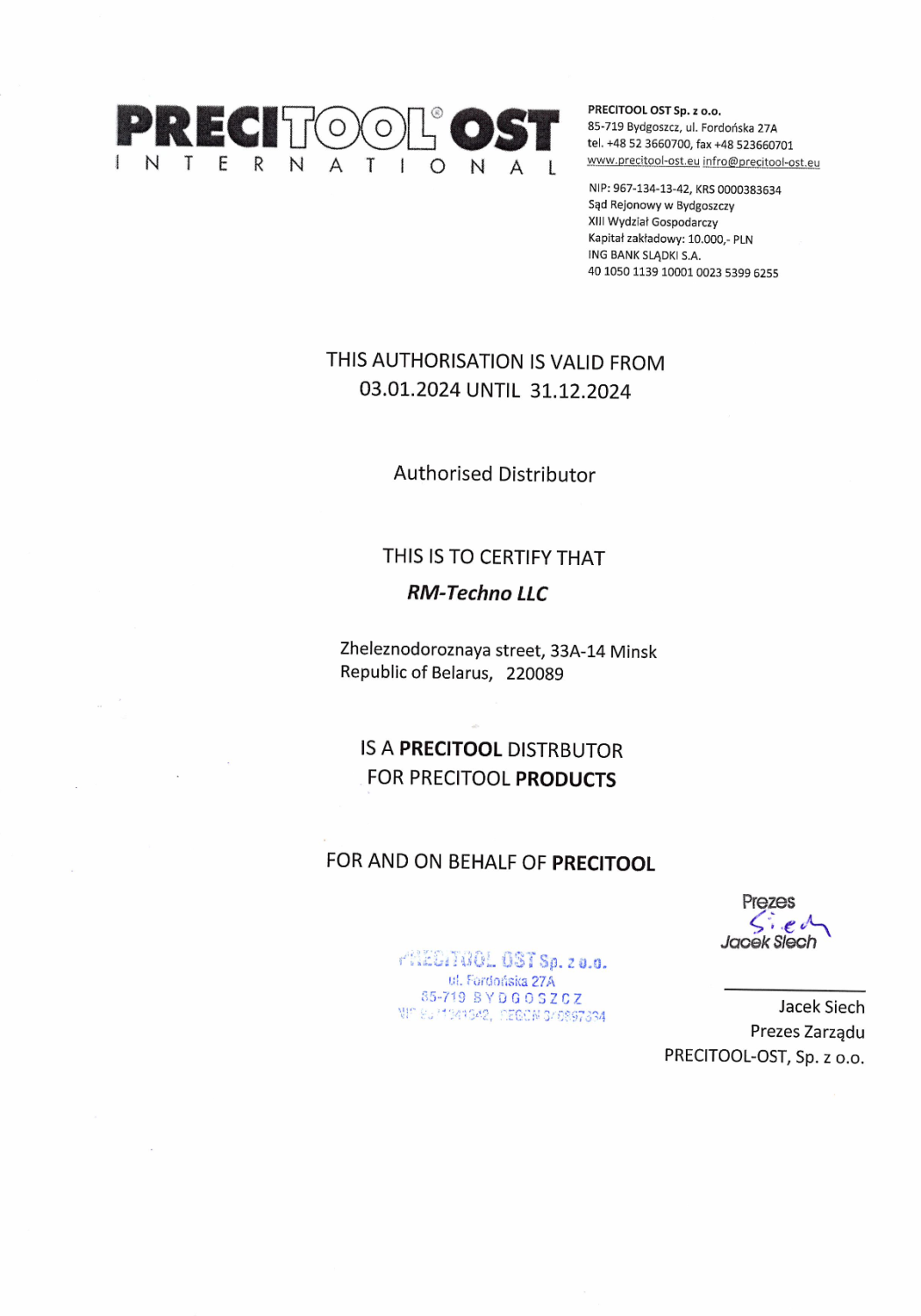 Данный документ подтверждает, что компания ООО "РМ-Техно" действительно является дистрибьютером продукции Precitool.