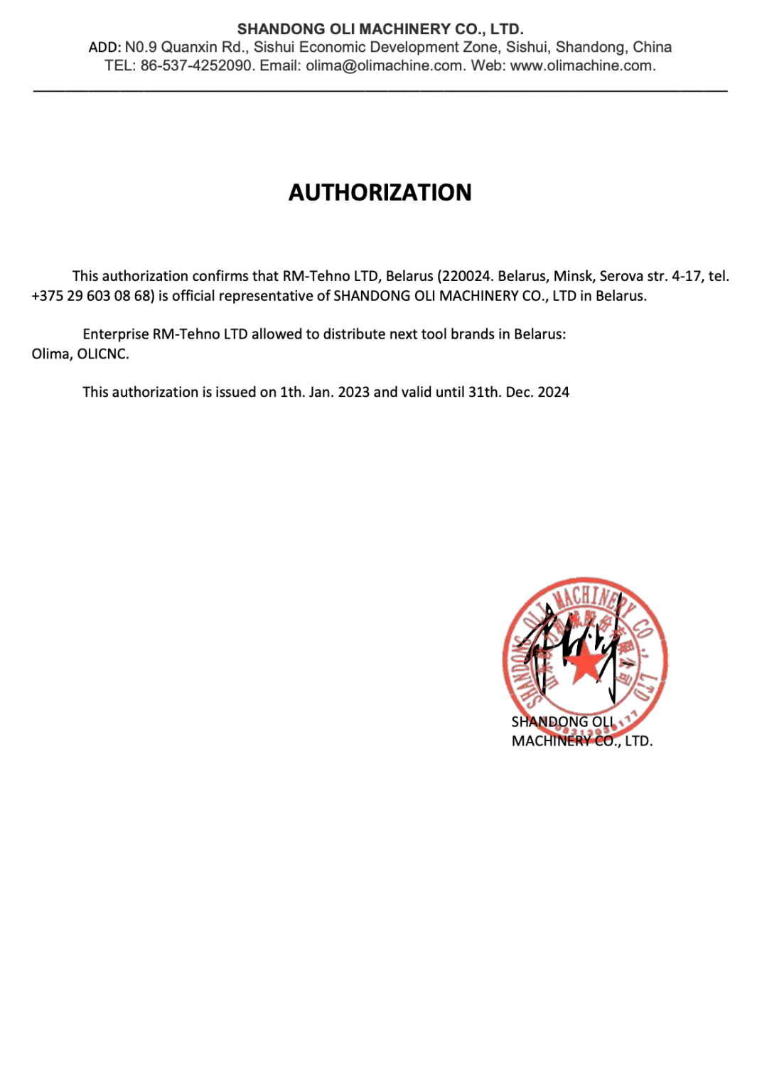 Данная доверенность подтверждает, что ООО "РМ-Техно", Беларусь (220024, Беларусь, г. Минск, ул. Серова, 4-17*, тел. +375 29 603 08 68) является официальным представителем SHANDONG OLI MACHINERY CO., LTD в Беларуси.
