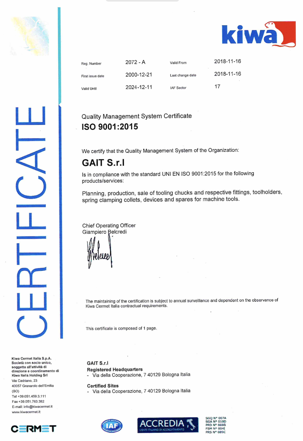 Соответствует стандарту UNI EN ISO 9001:2015 для следующих DIOSUSIE BREMERS.
