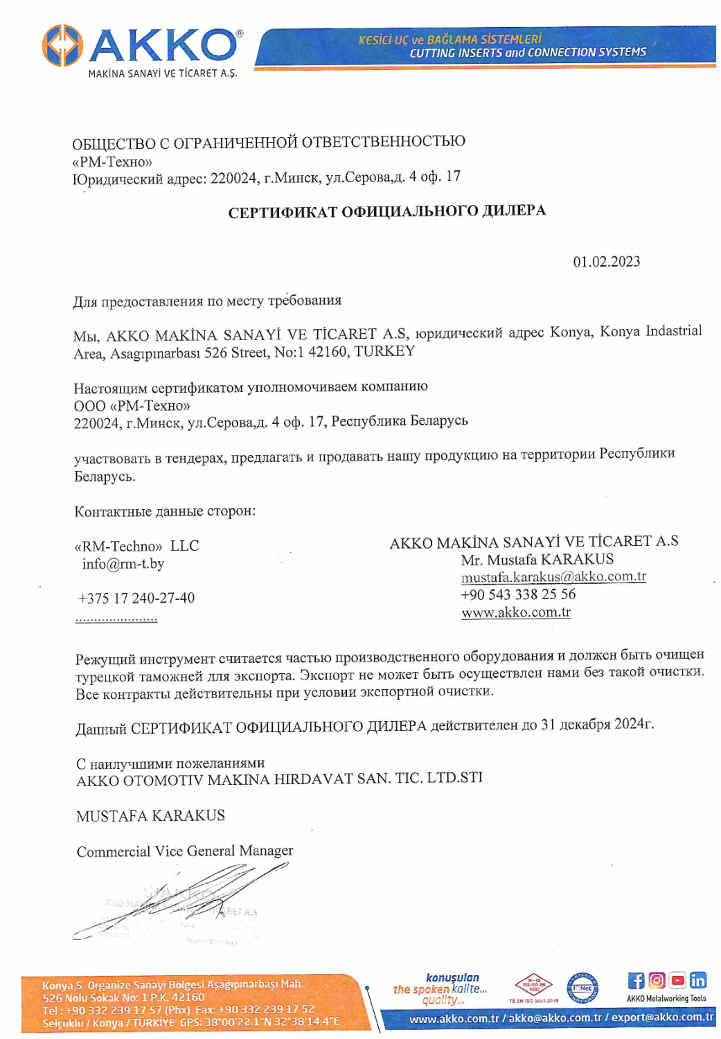 Настоящим сертификатом уполномочиваем компанию ООО "РМ-Техно" 220024, г. Минск, ул. Серова, д.4, оф. 17*, Республика Беларусь, участвовать в тендерах, предлагать и продавать нашу продукцию на территории Республики Беларусь.