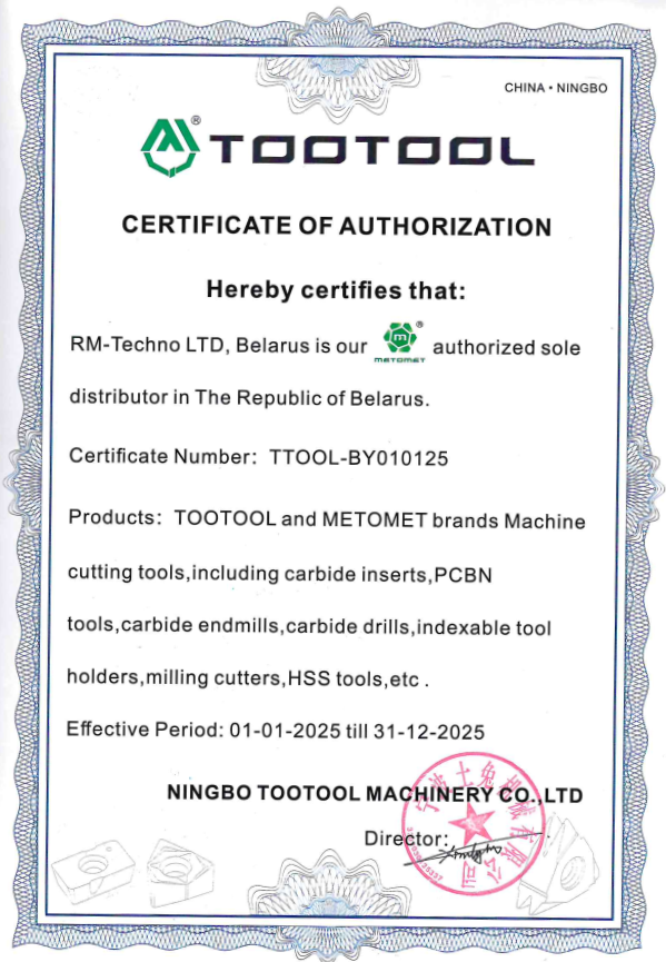 Данный документ подтверждает, что ООО "РМ-Техно" является эксклюзивным дистрибьютором "HUANA BRAND CNC CUTTING TOOLS" в Беларуси.